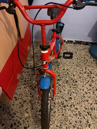 Bicicleta infantil con temática de Spiderman, ideal para los más pequeños. El cuadro es de color azul con detalles rojos y gráficos del personaje. - Ruedas de 14 pulgadas. - Sillín y manillar con diseño de Spiderman. - Frenos de mano. - Incluye ruedines de apoyo.