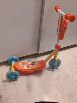 Patinete de tres ruedas con diseño de Paw Patrol, ideal para los más pequeños. Su estructura es de color naranja y amarillo, con ruedas azules. - Tres ruedas para mayor estabilidad. - Manillar con puños naranjas. - Plataforma con dibujos de Paw Patrol.