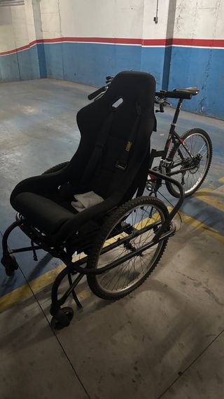 Bicicleta adaptada con asiento de silla de ruedas. - Asiento tipo baquet negro. - Ruedas de bicicleta de montaña. - Estructura metálica.