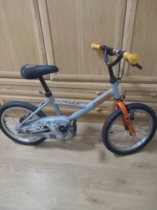 Bicicleta infantil de color gris con detalles naranjas y amarillos. - Ruedas de 16 pulgadas. - Sillín ajustable. - Puños de goma. - Diseño con gráficos.