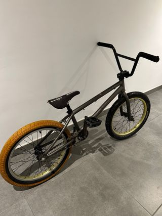 Bicicleta BMX de estilo urbano con un diseño llamativo. - Cuadro de color gris. - Ruedas con neumáticos de color naranja. - Llantas doradas.