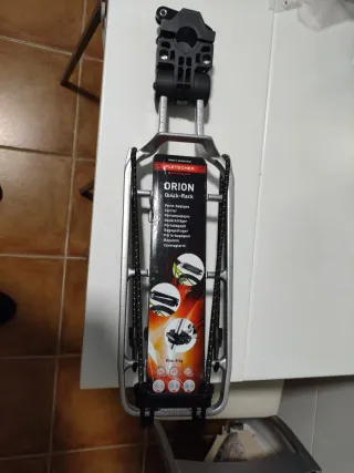 Portaequipajes para bicicleta marca Pletscher, modelo Orion Quick-Rack. Diseñado para facilitar el transporte de equipaje. - Fabricado en Suiza. - Carga máxima: 8 kg. - Compatible con ruedas de 24, 26 y 28 pulgadas. Regalo espray repara pinchazos