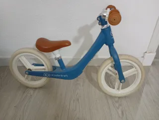 Bicicleta de aprendizaje de color azul con sillín y puños marrones. - Marco de metal resistente. - Ruedas blancas. - Marca: Kinderkraft. Con timbre