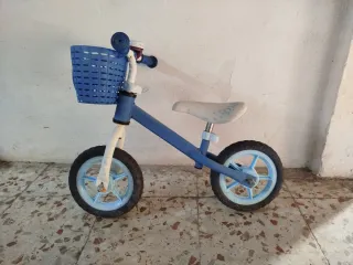Bicicleta de aprendizaje sin pedales, ideal para los más pequeños. - Color azul con detalles en blanco y celeste. - Cesta delantera azul. - Sillín blanco con diseño. - Ruedas con llantas celestes.