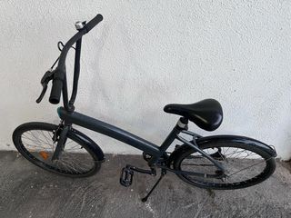 Bicicleta Riverside de Decathlon, ideal para niñas. Cuenta con guardabarros y cesta. - Color negro y coral. - Ruedas con banda blanca. - Frenos. - Cambio de marchas.