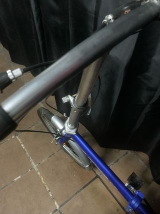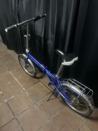 Bicicleta plegable Btwin en color azul marino con detalles en verde lima revisada y en perfecto estado. - Cuadro plegable. - Ruedas de 20 pulgadas. - Cambioo de 6 velocidades Shimano 105 - Guardabarros delantero y trasero. - Sillín negro. - Manillar y sillin ajustable en altura. - Luce delantera, timbre y reflectantes para mayor seguridad