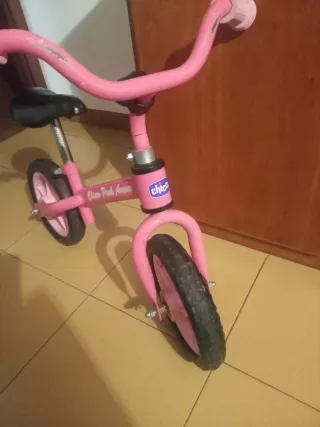 Bicicleta de aprendizaje Chicco en color rosa. - Marco de metal. - Ruedas de goma. - Asiento ajustable.