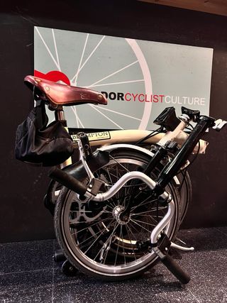 Bicicleta plegable Brompton original, ideal para desplazamientos urbanos y fácil de transportar. - Diseño compacto y ligero. - Cuadro de color crema. - Sillín de cuero marrón. - Bolsa de transporte negra. - Ruedas de 16 pulgadas.