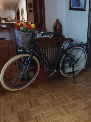 Bicicleta clásica en muy buen estado, ideal para paseos. - Color azul. - Cesta delantera. - Portaequipajes trasero. - Ruedas de banda blanca.