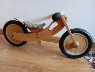 Bicicleta de equilibrio de madera, ideal para los primeros paseos. Al ser color madera, los peques la podrán pintar a su gusto :) - Fabricada en madera natural. - Ruedas de goma. - Sillín acolchado con estampado de cuadros. -Altura regulable