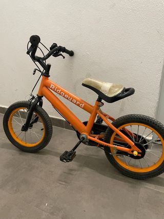 Bicicleta infantil de color naranja, marca Ridgeguard. Ideal para los más pequeños. - Ruedas con llantas naranjas. - Manillar negro con puños. - Sillín beige y negro.