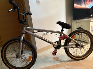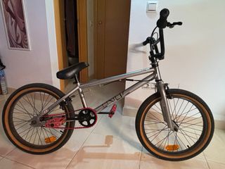 Bicicleta BMX de la marca Graviti en color plateado. - Cuadro de metal resistente. - Ruedas con llantas de color beige. - Pedales rojos. - Cadena roja. manillar 360