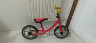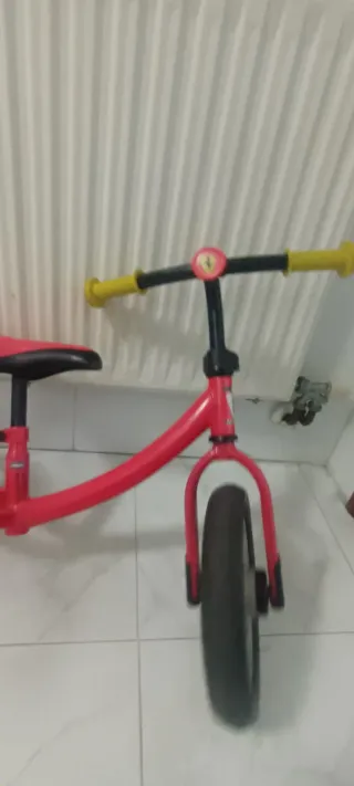 Bicicleta de aprendizaje para niños, ideal para iniciarse en el mundo de las dos ruedas. Estado aceptable, con todas sus funciones. - Color rojo vibrante. - Ruedas de goma. - Sillín ajustable en altura. - Puños de goma para un mejor agarre.