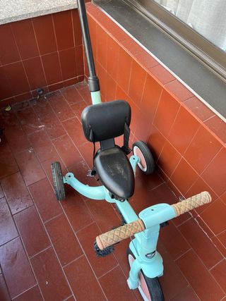 Triciclo evolutivo para niños pequeños, adaptable a diferentes etapas. - Color: azul claro y negro. - Asiento con respaldo. - Manillar con empuñaduras. - Ruedas con banda de rodadura.