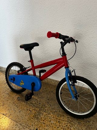 Bicicleta infantil con un diseño llamativo en color rojo y azul. - Ruedas de 16 pulgadas. - Cadena protegida con cubrecadenas azul. - Frenos en el manillar.