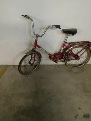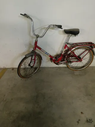 Bicicleta plegable clásica de color azul, ideal para desplazamientos urbanos o para llevarla contigo. - Cuadro de acero. - Ruedas de 20 pulgadas. - Portabultos trasero. - Guardabarros delantero y trasero. - Sillín ajustable Necesita reparación. Cambiar cubiertas, limpieza, engrase. Llantas con oxido