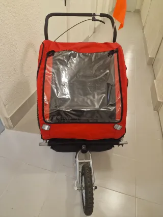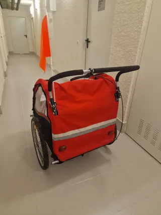 Práctico carro remolque para bicicleta, ideal para transportar objetos o mascotas. Cuenta con una bandera naranja de alta visibilidad. - Color principal: rojo. - Ruedas todoterreno. - Detalles reflectantes.