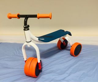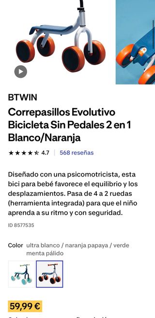 Bicicleta evolutiva Btwin de Decathlon, ideal para los primeros pasos en el mundo de las dos ruedas. - Diseño blanco y azul. - Ruedas naranjas con detalles en rojo. - Puños naranjas para un buen agarre. - Precio en tienda: 60€ Ha tenido muy poco uso, como nueva.