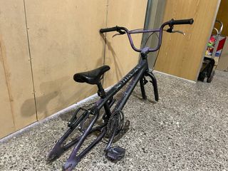 Se vende chasis de BMX con un diseño llamativo en morado y negro salpicado. - Cuadro de BMX. - Manillar morado. - Sillín negro. -sin freno delantero -freno trasero sin agustar ( lo puedes agustar )