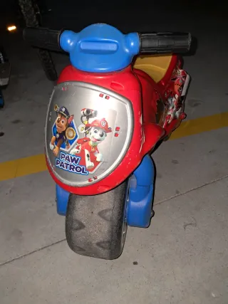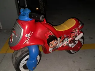 Moto de plástico roja y azul con diseño de Paw Patrol. - Ruedas de goma. - Asiento amarillo. - Pegatinas de personajes de Paw Patrol.