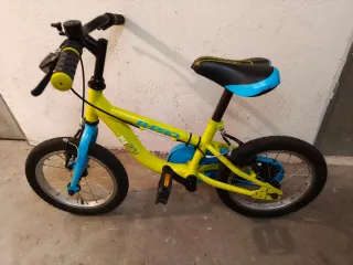 Bicicleta infantil B-PRO de 14 pulgadas. - Color amarillo y azul. - Diseño con dibujos. - Ruedines incluidos.