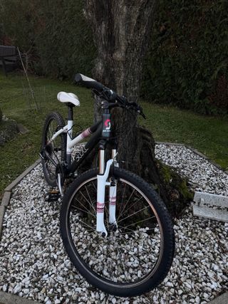 Bicicleta Scott en color negro y blanco con detalles rosas. En muy buen estado, pocas veces usada. 3 Marchas y 8 velocidades - Cuadro de aluminio. - Suspensión delantera. - Frenos de disco.