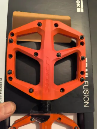 Pedales de plataforma Look Trail Fusion en color rojo. Uno con un día de uso, el otro a estrenar - Diseño robusto y ligero. - Pines para un agarre óptimo. - Eje de pedal roscado