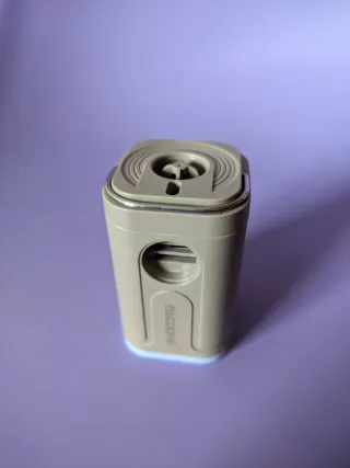 Este compresor de aire es compacto y fácil de usar. - Color beige. - Botón ON/OFF. - Tiene una luz incorporada. - Una asa para colgar.