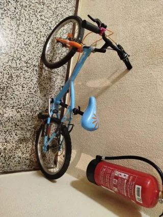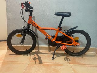 Bicicleta infantil Btwin modelo Robot 500 en color naranja y negro. Ideal para niños de entre 4 y 6 años con un divertido estampado de robot. Está prácticamente nueva, muy poco uso. Todo en perfecto funcionamiento - Cuadro de acero. - Ruedas de 16 pulgadas. - Frenos delanteros y traseros. - Guardabarros delantero y trasero. - Protector de cadena con diseño de robot. - Ajuste de la altura del sillín - Ajuste de la altura del manillar - Sillín anatómico