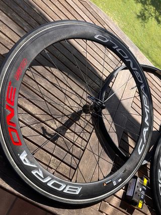 Juego de ruedas de carbono Campagnolo Bora One 50 para bicicleta de carretera. Diseñadas para ofrecer un rendimiento aerodinámico y ligereza. Ruedas funcionando perfectamente, radios en perfecto estado y pista de frenado igual. - Material: Carbono - Perfil: 50 mm - Marca: Campagnolo - Modelo: Bora One 50 Par cubiertas tubulares Se incluye casete Shimano, liquido sellante usado, zapatas de frenado campagnolo originales, y cubierta nueva adicional Tufo. La cubierta de una de las ruedas es Victoria Rally y también esta sin estrenar.