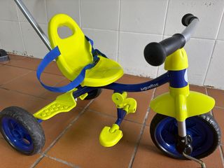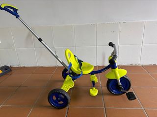 Triciclo infantil de la marca Juguettos, con un diseño llamativo en colores amarillo y azul. - Asiento ergonómico. - Barra de empuje. - Cinturón de seguridad. - Reposapiés. - Ruedas resistentes. En buen estado. Está rayado el palo de empuje pero lo demás está bien.
