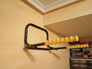 Soporte de pared para colgar bicicletas. Fabricado en metal negro con mangos de goma amarillos para proteger el cuadro. - Estructura metálica resistente. - Mangos de goma amarillos.