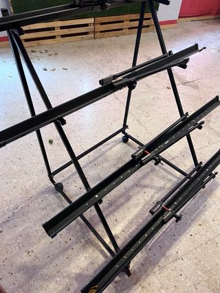 Soporte de reparación para bicicletas, ideal para mantenimiento y ajustes. - Construcción robusta y estable. - Pinza ajustable para diferentes diámetros de cuadro. - Bandeja para herramientas integrada. - Patas plegables para fácil almacenamiento.
