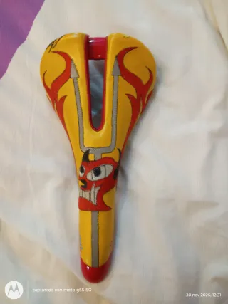 Sillín de bicicleta Mythos, edición especial. - Diseño llamativo con temática de diablo y llamas. - Colores amarillo, rojo y detalles en gris. - Raíles grises. - Forma ergonómica.