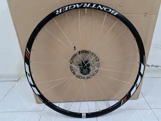 Rueda delantera de bicicleta de montaña Bontrager de 26 pulgadas. - Llanta negra con detalles en blanco y naranja. - Radios plateados. - Incluye disco de freno.