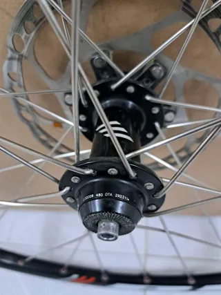 Juego de dos ruedas Orbea de 29 pulgadas con discos. - Llantas de aluminio negro. - Radios negros. - Bujes negros con discos de freno centerlock. -Rueda trasera con una pequeña holgura en el buje -Rueda delantera en perfecto estado. -Pequeños picotazos del uso
