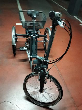 Triciclo plegable con un diseño práctico y funcional. El asiento se puede desmontar fácilmente. - Estructura metálica. - Asiento doble. - Ruedas para movilidad,sillin y batería de repuesto, cargador,soporta peso hasta 110kg, usado solamente 2 veces,se puede usar también para movilidad reducida