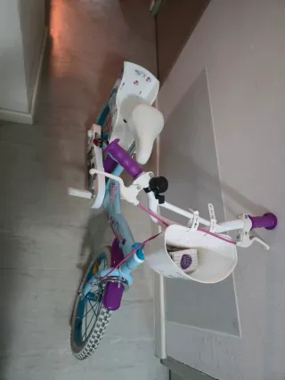 Bicicleta infantil con temática de Frozen. - Color azul y morado. - Cesta delantera con diseño de Frozen II. - Casi sin uso. Como accesorios incluye un asiento para llevar un muñeco, guardabarros y una cesta delantera. Aunque no salgan en las fotos se entrega con ruedines. Sólo trato en mano