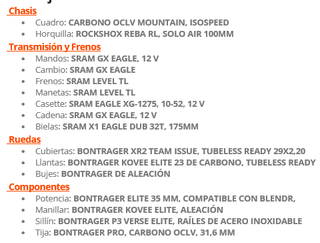 Trek Procaliber 9.7 2023 Gen 2, Bici top de XC, ligera y rápida. No veras un solo razguño.Cuadro y llantas de carbono, con factura 2023. Solo cambie cadena en tienda oficial. Tubelizada. Poco uso. La vendo por lesión rodilla y espalda. Cuadro OCLV Carbono con IsoSpeed, horquilla RockShox Reba RL 100 mm, transmisión SRAM GX Eagle 12v, frenos Level TL, cassette 10‐52 y bielas X1. Ruedas Bontrager Kovee Elite de carbono con cubiertas XR2 tubeless. Componentes Bontrager: potencia Elite, manillar Kovee, sillín Verse Elite y tija Pro de carbono. Peso declarado 10.4kg Specialized, cannondale, scott, Giant, Orbea, ktm, Mondraker, Cube