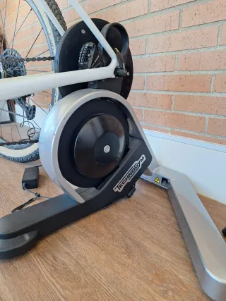Rodillo de entrenamiento Technogym para bicicletas. - Diseño en color plata y negro. - Marca Technogym visible en el lateral.