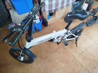 Bicicleta eléctrica plegable de color blanco, marca Ess Watt. Ideal para desplazamientos urbanos. - Diseño plegable para fácil almacenamiento y transporte. - Ruedas de tamaño reducido. - Sillín negro. - Guardabarros delantero y trasero. Entregó en la mano no hago envíos