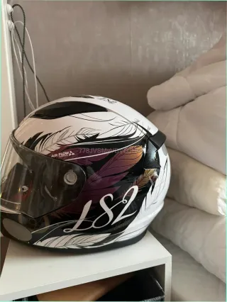 Casco de moto integral LS2 con un diseño blanco y estampado de plumas en tonos morados y negros. Incluye visor. - Diseño con plumas. - Color blanco. - Visor incluido.