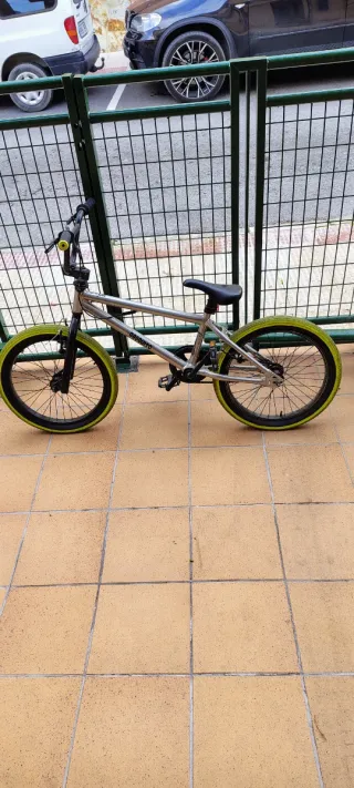 Bicicleta BMX de color plateado con ruedas de color verde lima. Solo se ha utilizado por dos meses, está a estrenar - Cuadro de metal. - Sillín negro. - Pedales negros - volante con giro 360°