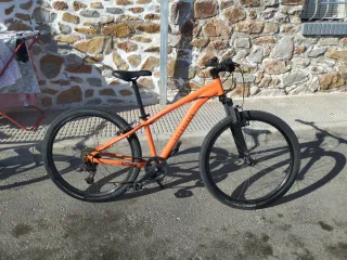Bicicleta de montaña en color naranja, ideal para iniciarse en el ciclismo. - Cuadro de aluminio. - Ruedas de 27.5 pulgadas. - Frenos de disco. - Cambio Shimano.