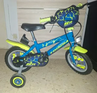Bicicleta infantil de la marca SR Toimsa, con ruedas de 12 pulgadas. Está nueva, el niño la ha usado 3 veces contadas y se le ha quedado pequeña. Recomendada para niño/a de 3 a 5 años. - Color azul con detalles en amarillo y negro. - Diseño deportivo con gráficos. - Incluye ruedines de apoyo. - Incluye soporte para botella.