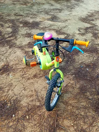Bicicleta infantil de color verde, ideal para los más pequeños. - Ruedines incluidos para mayor estabilidad. - Diseño divertido con dibujos.