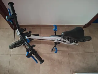 Bicicleta infantil de color blanco con detalles en azul. Ideal para los más pequeños. - Ruedas de 16 pulgadas. - Frenos de mano. - Sillín ajustable. - Incluye ruedines.