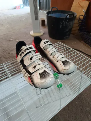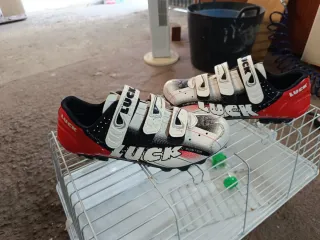 Zapatos de ciclismo Luck Evolution Custom en color blanco, negro y rojo. - Cierre con velcros. - Diseño deportivo. Le dejo las calas puestas para que las uses tú. Usadas una vez, me quedaban pequeñas. Una pena porque tienen un acabado fantástico.