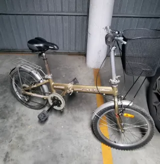 Bicicleta plegable de color dorado, ideal para desplazamientos urbanos. Su diseño permite guardarla fácilmente. De Coleccionista - Ruedas de tamaño reducido. - Cesta delantera. - Guardabarros. - Portabultos trasero.