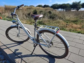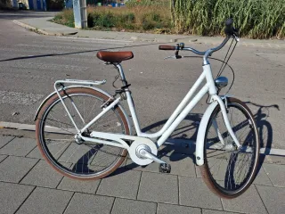 Bicicleta de paseo de la marca Winora en color blanco. Ideal para desplazamientos urbanos. - Cuadro de aluminio. - Ruedas de 28 pulgadas. - Sillín de cuero marrón. - Portaequipajes trasero.